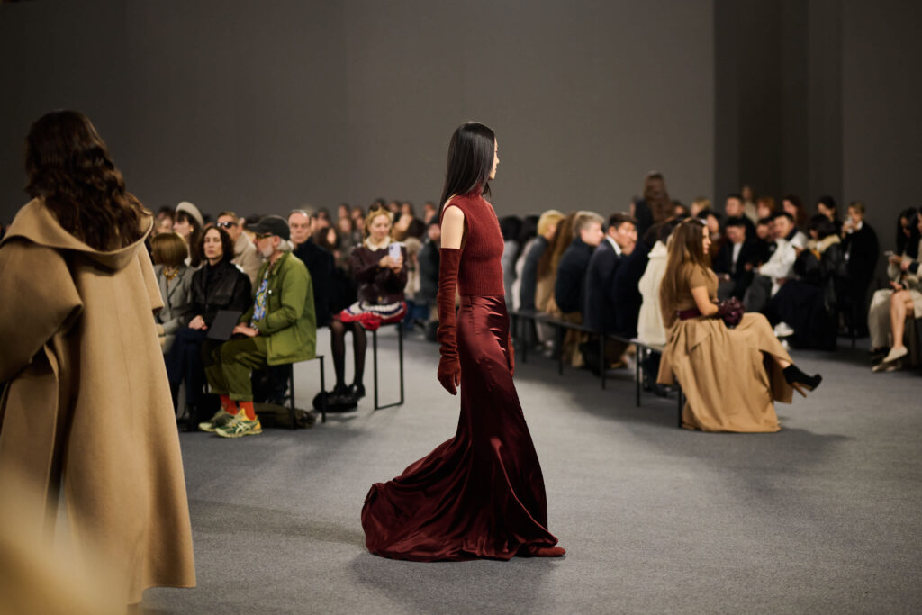 Max Mara 2026秋冬系列從中世紀風格與哥德式魅力汲取靈感,向象徵智慧與權力的歷史人物——瑪蒂爾達·迪·卡諾薩(Matilde di Canossa)致敬,透過拼接羊絨長裙、束腰上衣、質地柔軟的中長靴、金屬鉚釘細節以及建築感闊肩外套等等,演繹剛柔並濟的現代女性形象。