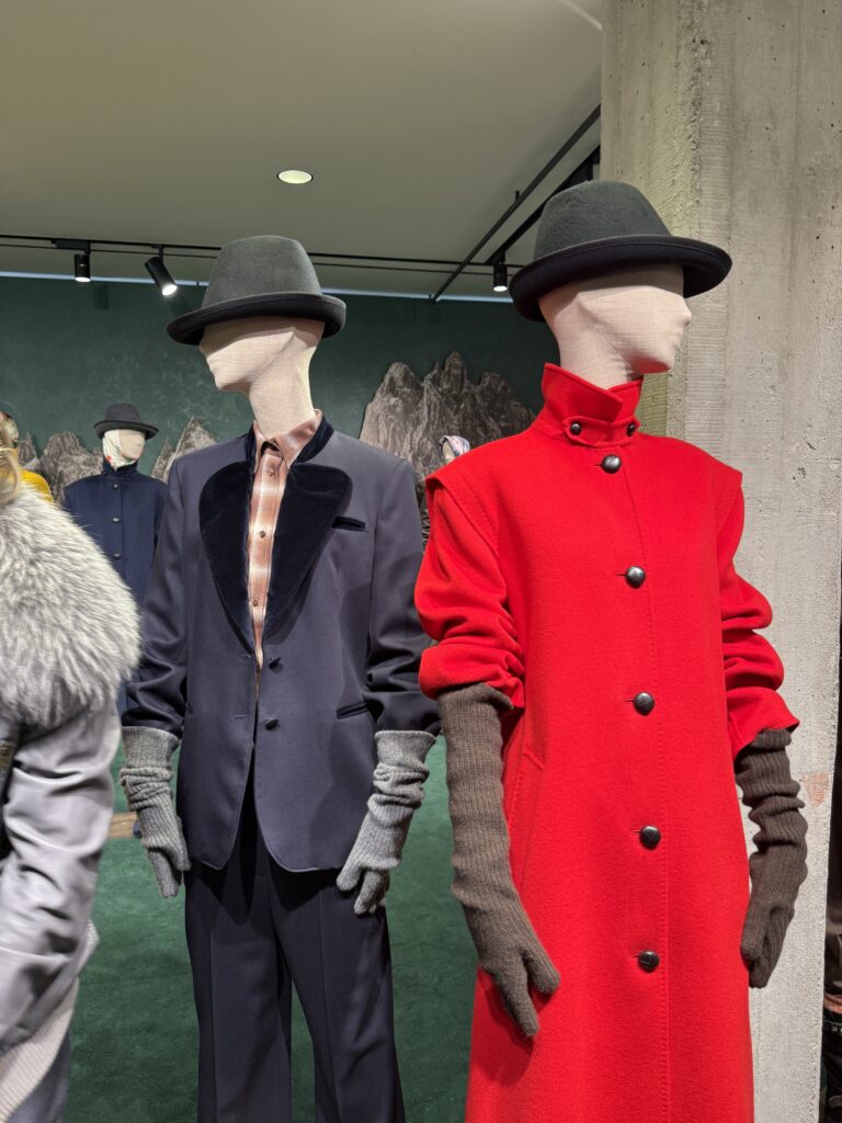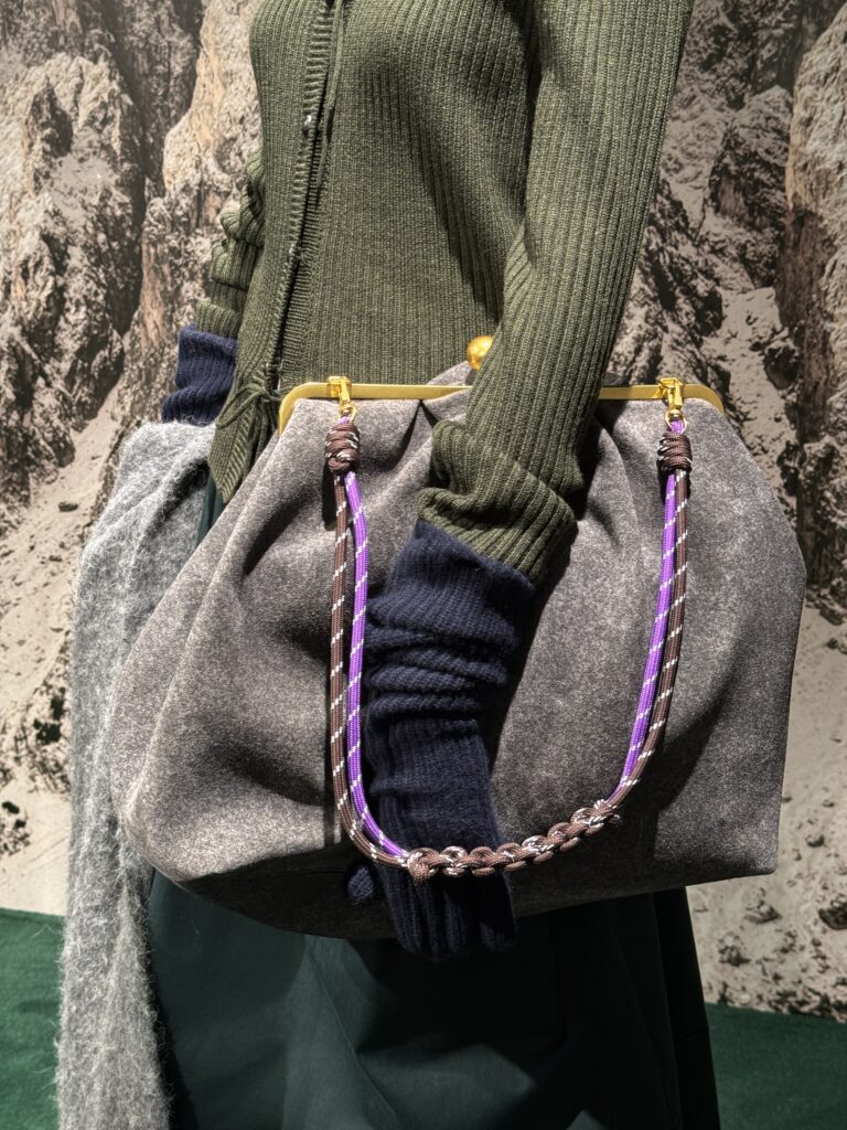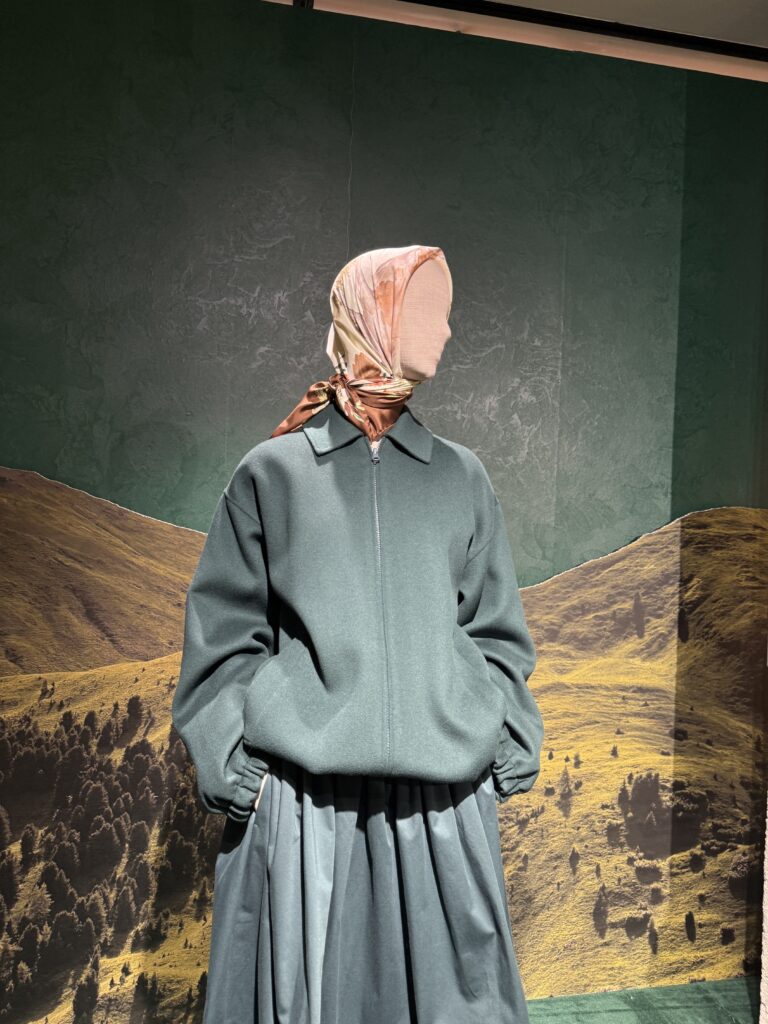 系列靈感源自傳統奧地利的阿爾卑斯外套,以羊毛氈呢為主材質,透過混色效果、包袖與倒褶襉輪廓及綠色調,展現剛柔並濟的優雅。