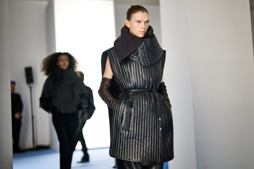 本季著重於廓形實驗與領口變化,以品牌標誌性的雙面呢面料為基礎,強調對比與並置。作為核心的背心式外套,配搭大面積領口,展現多功能性。